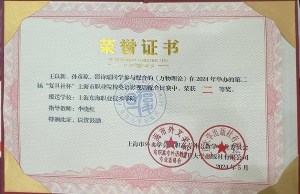 5月17日,由上海市外文学会高职高专外语教学专业委员会联合“复旦新学术”、复旦大学出版社主办的第二届“复旦社杯”上海市职业院校英语影视剧配音比赛决赛落下帷幕,上海24所高职高专院校参赛。我校基础部选送的配音作品《万物理论》(王以新,孙彦琼,邵诗瑶)、《中国如何从“中国制造“走向“中国设计”》(刘英至)、《月球陨落》(吴谷,严诗涵)三部配音作品从复赛的60余件作品中脱颖而出闯入决赛。最终,配音作品《万物理论》获得本次大赛二等奖、《中国如何从“中国制造“走向“中国设计”》(指导老师:倪盈盈)、《月球陨落》(指导老师:张悦)获得三等奖,李晓红老师获得优秀指导教师奖。