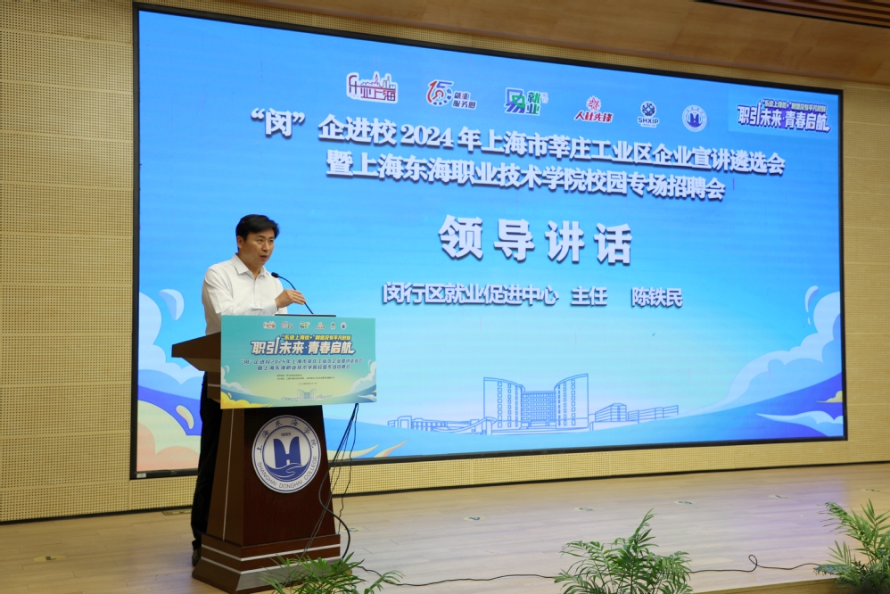 闵行区就业促进中心陈铁民主任在讲话中表示,在上海东海学院、莘庄工业区和在场企业的大力支持下,“闵”企进校系列校招活动顺利开展,和学校精准就业供需匹配,将学校的优势专业和闵行区重点行业企业进行直联对接,既能满足区内企业的用工需求,也能为学生提供就业机会。未来,闵行区将持续延伸企业服务触角,不断探索政校企合作新途径,力促学校毕业生更充分高质量就业,做好就业服务的有效性。