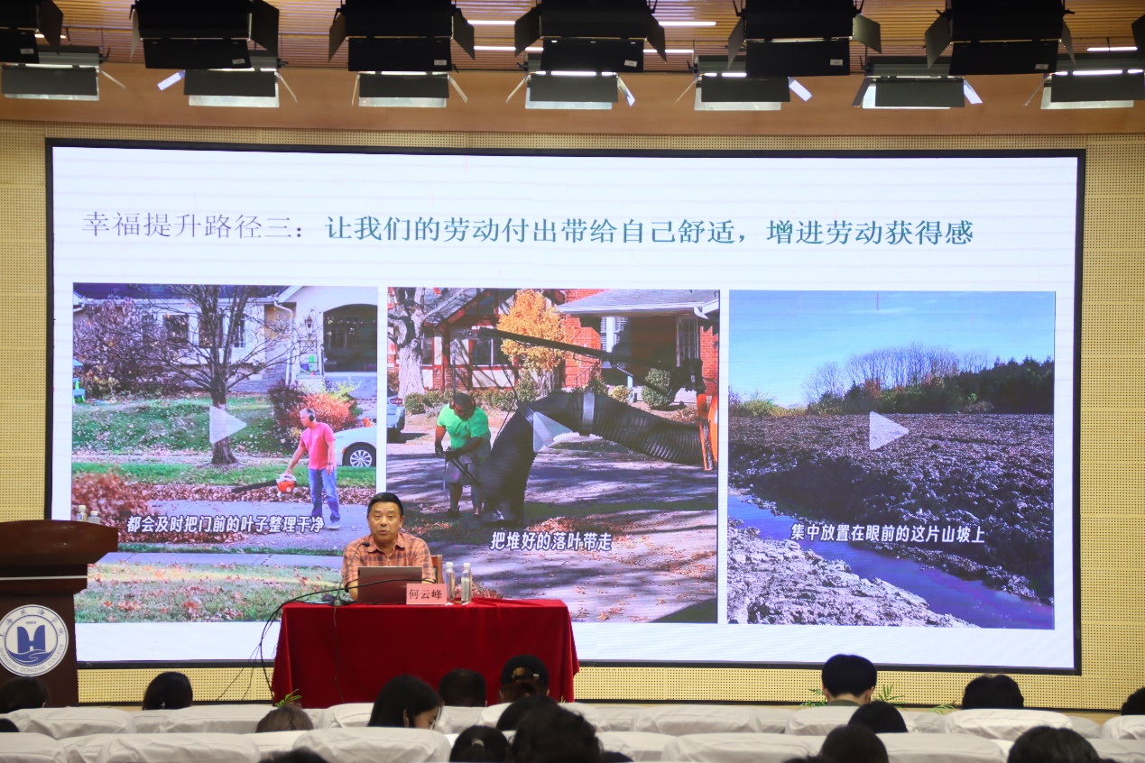何云峰教授还讲到了幸福的提升路径:让我们的劳动付出带给他人益处,增进劳动自豪感;让我们的劳动过程充满创造性,增进劳动成就感;让我们的劳动付出带给自己舒适,增进劳动获得感;让我们的劳动过程富有技术含量,增进劳动轻松感;让我们的劳动服务于人类美好生活,增进劳动崇高感;让我们的劳动有问题针对性,增进劳动挑战感。