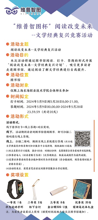 6.开展阅读竞赛活动。59日至528日,图书馆联系重庆维普(电子资源供应商)开展“维普智图杯”阅读改变未来——文学经典复兴竞赛活动,通过读者到馆阅读、打卡、线上答题的形式,吸引众多读者走进图书馆,通过阅读了解文学经典、达到自我提升。此次活动设置有华为运动手环、松下台灯、金士顿32G U盘等丰厚奖品,最终高明(经管学院)、罗海燕(经管学院)、沈珈琦(护理学院)等30名读者获奖。
