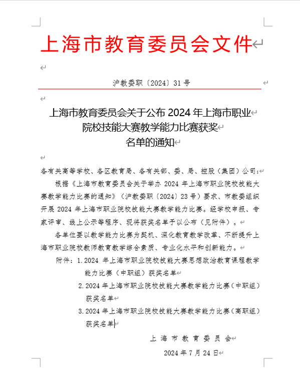 近日,上海市教育委员会公布了2024年上海市职业院校技能大赛教学能力比赛获奖结果。我校基础部英语教研室参赛团队获得三等奖。