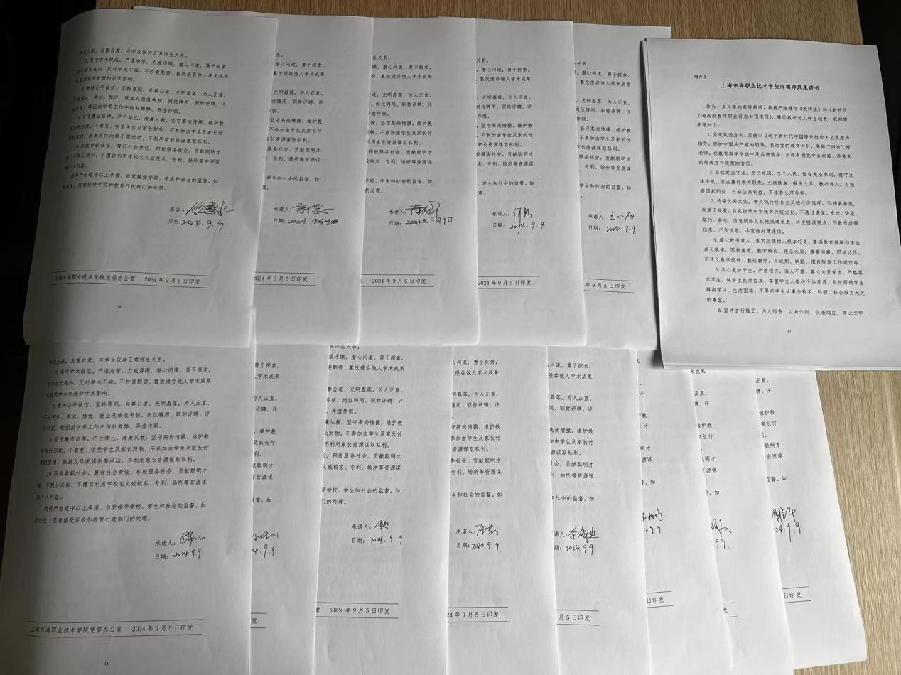 会议现场,全体教师怀着庄重而严肃的心情,共同签署了师德师风承诺书。这份承诺书不仅是每位教师对自身职业操守的庄重承诺,更是对教育事业的坚定信仰与责任担当。这一行动充分展示了学院对提升教师队伍素质的高度重视和坚决态度。