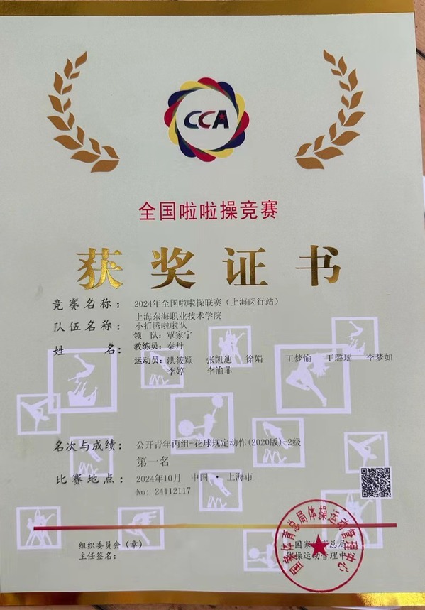 2024年10月12日上午,东海学院“小折腾啦啦队”在基础部体育教研室秦丹老师的带领下,正式踏上前往全国啦啦操联赛(上海闵行站)的征途,并在公开青年丙组花球规定动作(2020版)-2级的比赛中荣获第一名,为学校赢得了荣誉。