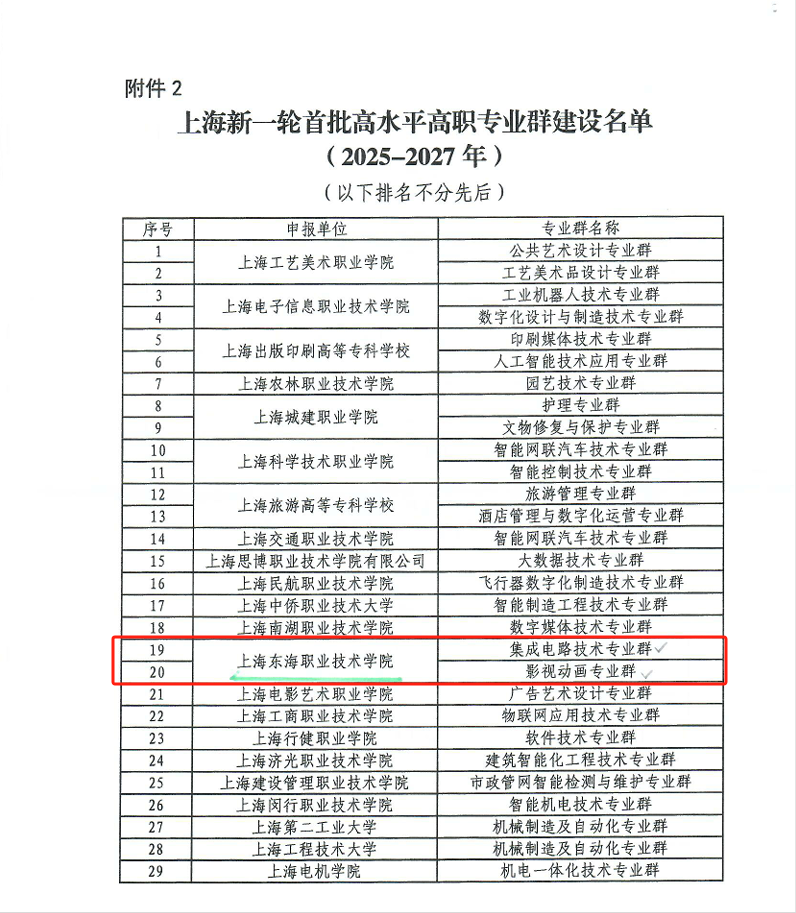 近日,上海市教育委员会公布了上海市新一轮首批高水平高职专业群建设名单,我校报送的集成电路技术和影视动画两个专业群全部获批。